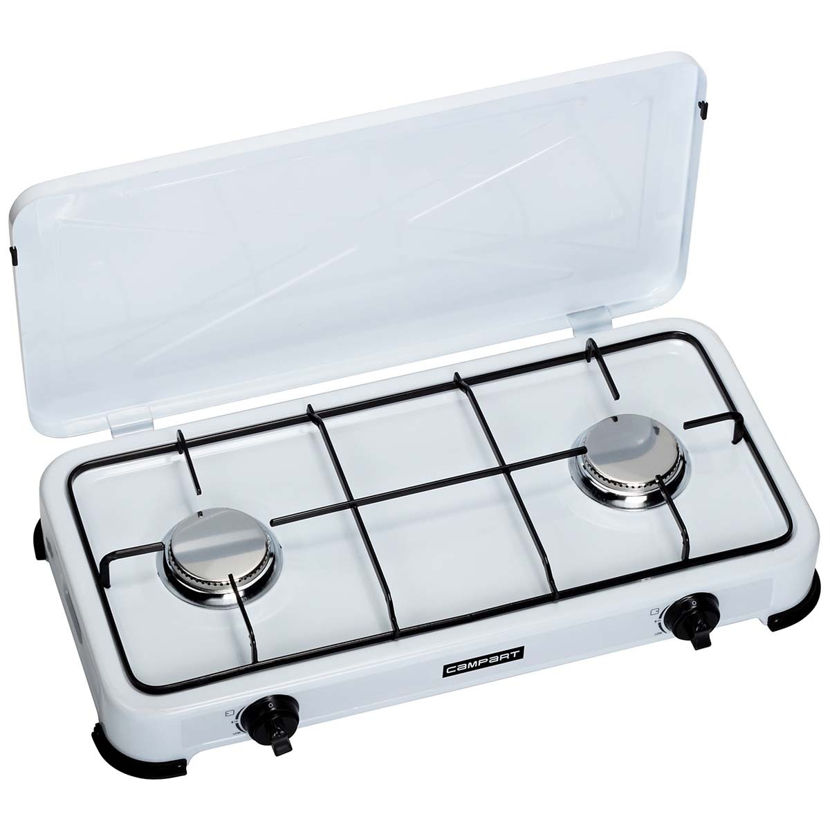 Een compact en stabiel 2-pits gaskomfoor. Beschikt over 2 regelbare branders met ieder een capaciteit van 1500 Watt. Het gaskomfoor is voorzien van een haakse slangpilaar. Deze is geschikt voor een aansluiting op hervulbare gasflessen door middel van een drukregelaar en een gasslang. Daarnaast is dit gaskomfoor voorzien van gefixeerde branderkoppen, geïntegreerde handvatten en een deksel.