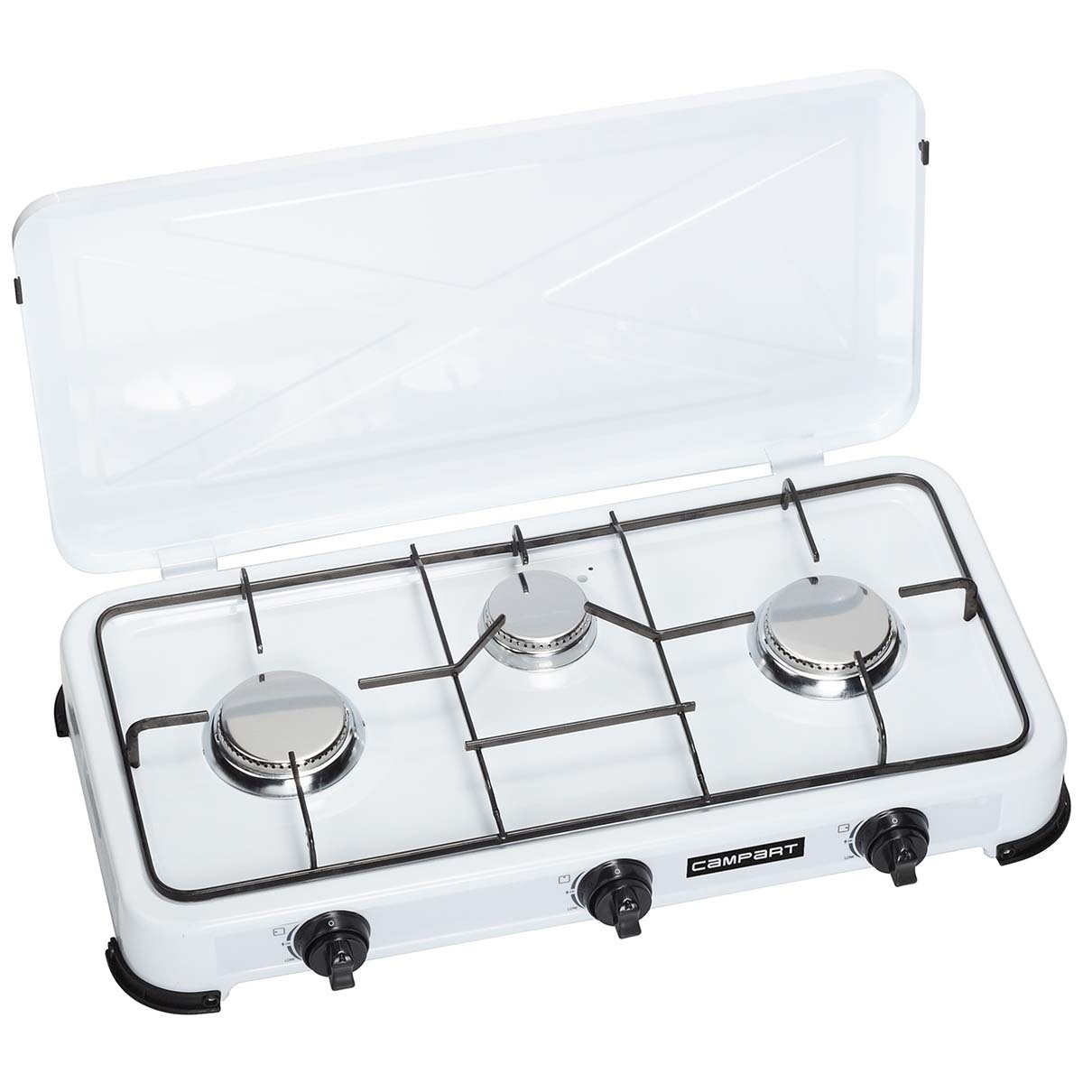 Een compact en stabiel 3-pits gaskomfoor. Beschikt over 3 regelbare branders met 2x een capaciteit van 1500 Watt en 1x een capaciteit van 1000 Watt. Het gaskomfoor is voorzien van een haakse slangpilaar. Deze is geschikt voor een aansluiting op hervulbare gasflessen door middel van een drukregelaar en een gasslang. Daarnaast is dit gaskomfoor voorzien van gefixeerde branderkoppen, geïntegreerde handvatten en een deksel.