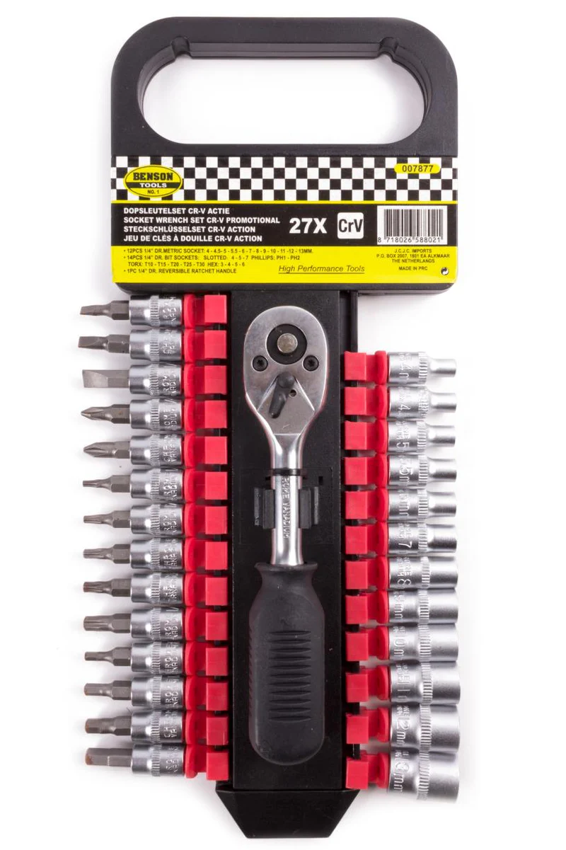 Deze dopsleutelset 27-delig van chroom-vanadiumstaal (Cr-V) is een complete en robuuste set voor uiteenlopende montage- en onderhoudswerkzaamheden. Dankzij de sterke ratel, diverse doppen en accessoires is de set geschikt voor zowel professioneel gebruik als doe-het-zelf klussen. De actieset wordt geleverd in een compacte en overzichtelijke opbergkoffer.