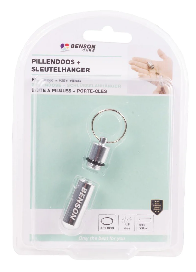 Handige pillendoos en sleutelhanger ineeno Perfect voor op reis, vakantie en outdoor activiteiteno Van lichtgewichte aluminiumo Spatwaterdicht: pillen blijven goed droogo Afmeting: 14 x 52mm