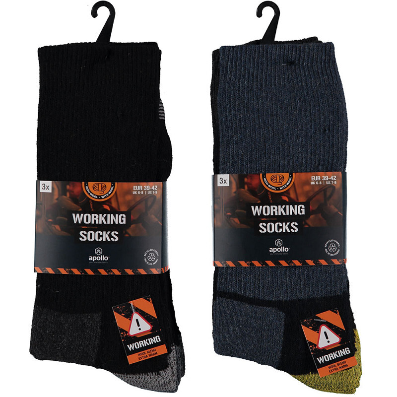 Jouw voeten blijven goed warm dankzij deze functionele thermo werksokken van gerecycled wol blend en volledig badstof binnenkant. Deze Apollo werksokken zijn bijzonder slijtvast dankzij de extra versterkte tenen en hiel. De elastische wreef en perfecte pasvorm zorgen dat ze goed om de voet blijven zitten. De brede elastische boorden zorgen ervoor dat deze functionele sokken niet knellen aan het onderbeen en niet afzakken. Dit maakt ze bijzonder geschikt om te dragen in veiligheidsschoenen, klompen en werkschoenen. Geleverd als aantrekkelijk 3-pack. Apollo, your everdyay basics.